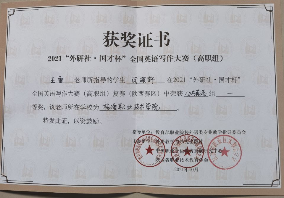 近日,2021“外研社·国才杯”全国大学生英语写作、演讲大赛(高职组)陕西赛区复赛成绩公布。我校学生闵琛轩获公共英语组写作大赛省级一等奖,赵亚莉获公共英语组写作大赛省级二等奖,覃雅楠获英语演讲大赛省级二等奖。