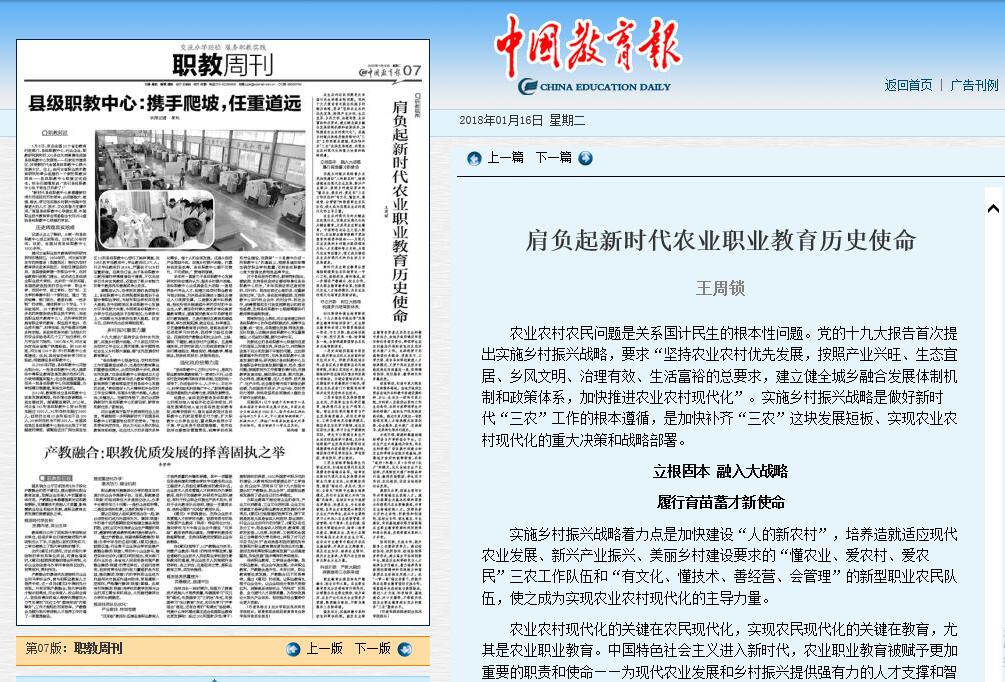 1月 16 日 , 《中国教育报》 7 版刊发了我院院长王周锁署名文章《肩负起新时代农业职业教育历史使命》, 全文刊载如下(详情进入):